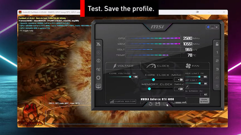 - Tăng dần Core Clock (+50 → +100 MHz) và Memory Clock (+100 → +200 MHz).