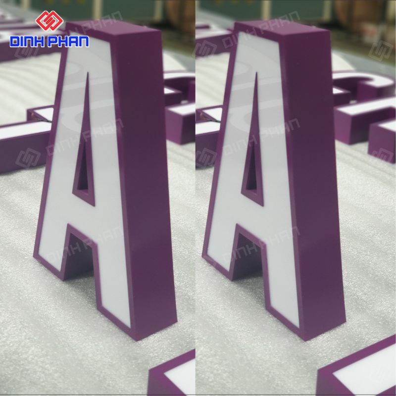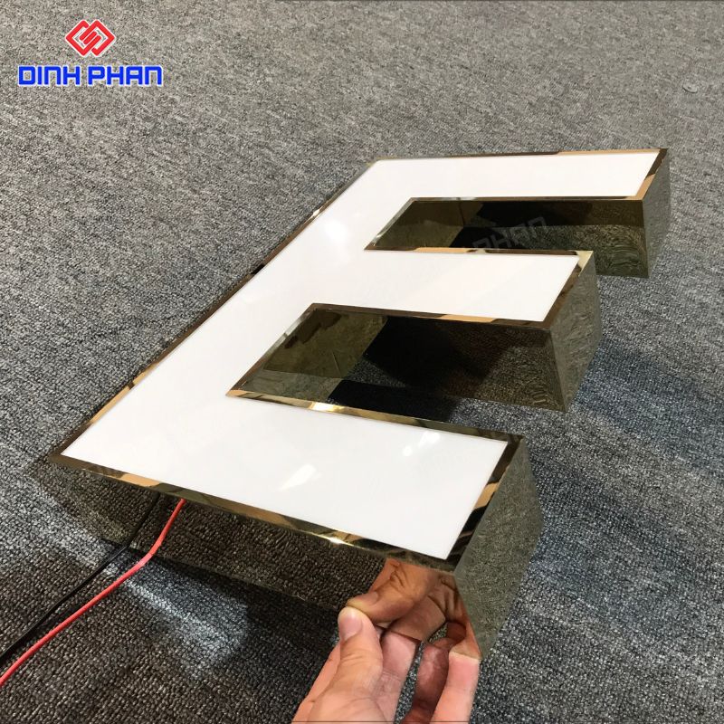 Đối với các mẫu chữ nổi inox 3D có yêu cầu chiếu sáng, Đèn LED module sẽ được gắn vào bên trong hoặc phía sau chữ để tạo hiệu ứng sáng chân hoặc sáng mặt (kết hợp với Mica (Acrylic)).