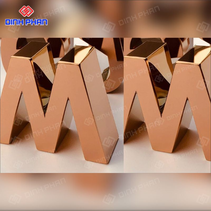 Chữ inox hồng, hay còn gọi là chữ inox màu hồng đồng, thực chất là sản phẩm được gia công từ tấm Inox 304 cao cấp, sau đó được mạ một lớp màu hồng theo công nghệ mạ PVD tiên tiến. Công nghệ này tạo ra một lớp phủ có độ bám dính cực cao, màu sắc đồng đều, sáng bóng và có khả năng chống oxy hóa, chống ăn mòn tuyệt vời.