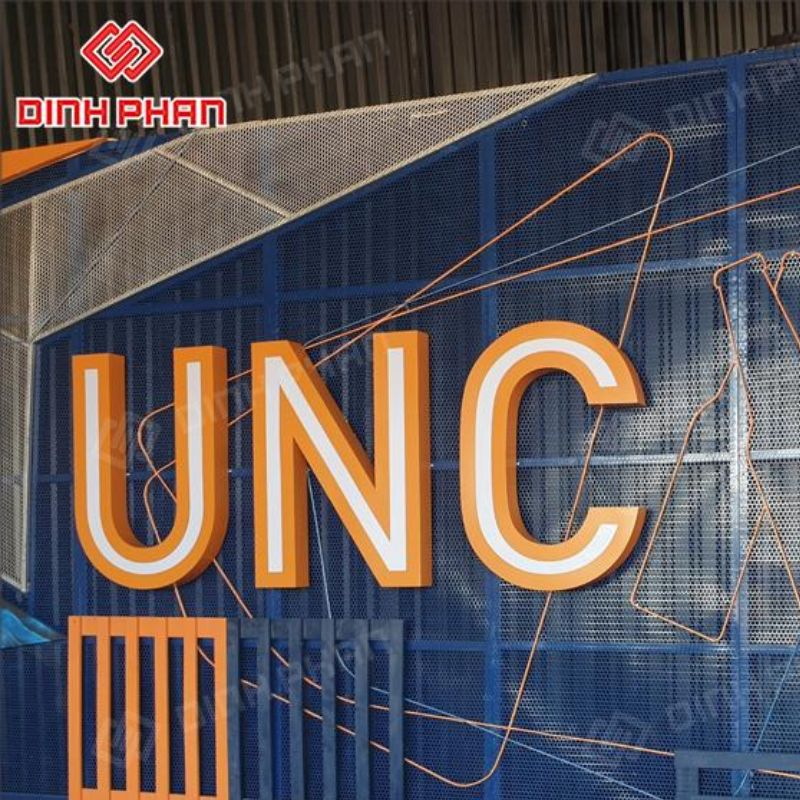 Ngoài các mẫu chữ liền khối, chúng tôi còn có thể tạo ra các thiết kế độc đáo như chữ chân inox đục lỗ để kết hợp với đèn LED, tăng thêm hiệu ứng thị giác.