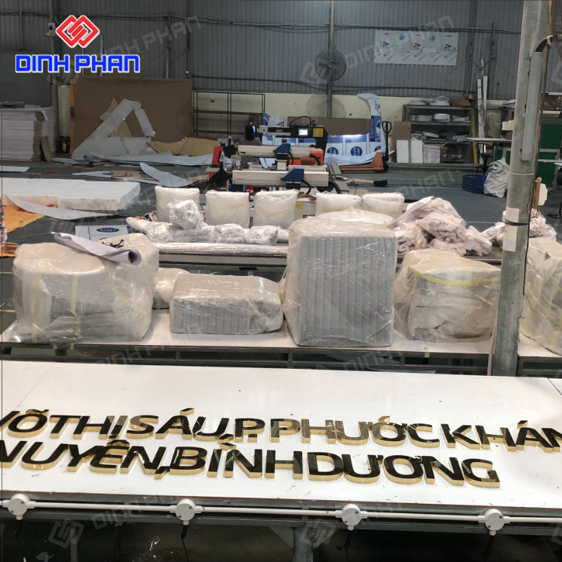 Sau khi hoàn thiện, chữ được đánh bóng, vệ sinh sạch lớp keo dư và bọc màng PE bảo vệ trước khi vận chuyển đến công trình.